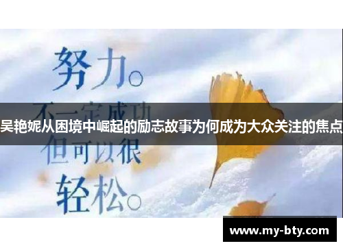 吴艳妮从困境中崛起的励志故事为何成为大众关注的焦点?她的奋斗经历不仅令人动容,更激励了无数处于困境中的人们重新审视自己的人生选择。吴艳妮的故事充满了跌宕起伏的挑战、勇敢突破的精神以及最终战胜逆境的成功。作为一个曾经深陷困境的普通人,吴艳妮用她坚韧不拔的毅力证明了即便面对巨大的困难和压力,只要坚持不懈,就能迎来光明的未来。在这篇文章中,我们将从四个方面详细分析为何吴艳妮的励志故事能够成为大众关注的焦点。首先是她勇敢面对困境的决心,其次是她坚韧不拔的奋斗精神,再者是她如何从失败中汲取经验,并最终实现自我超越,最后是社会和大众对她经历的认同与共鸣。通过这些方面,我们能够更加深刻理解吴艳妮的故事为何能激起如此强烈的关注和共鸣。